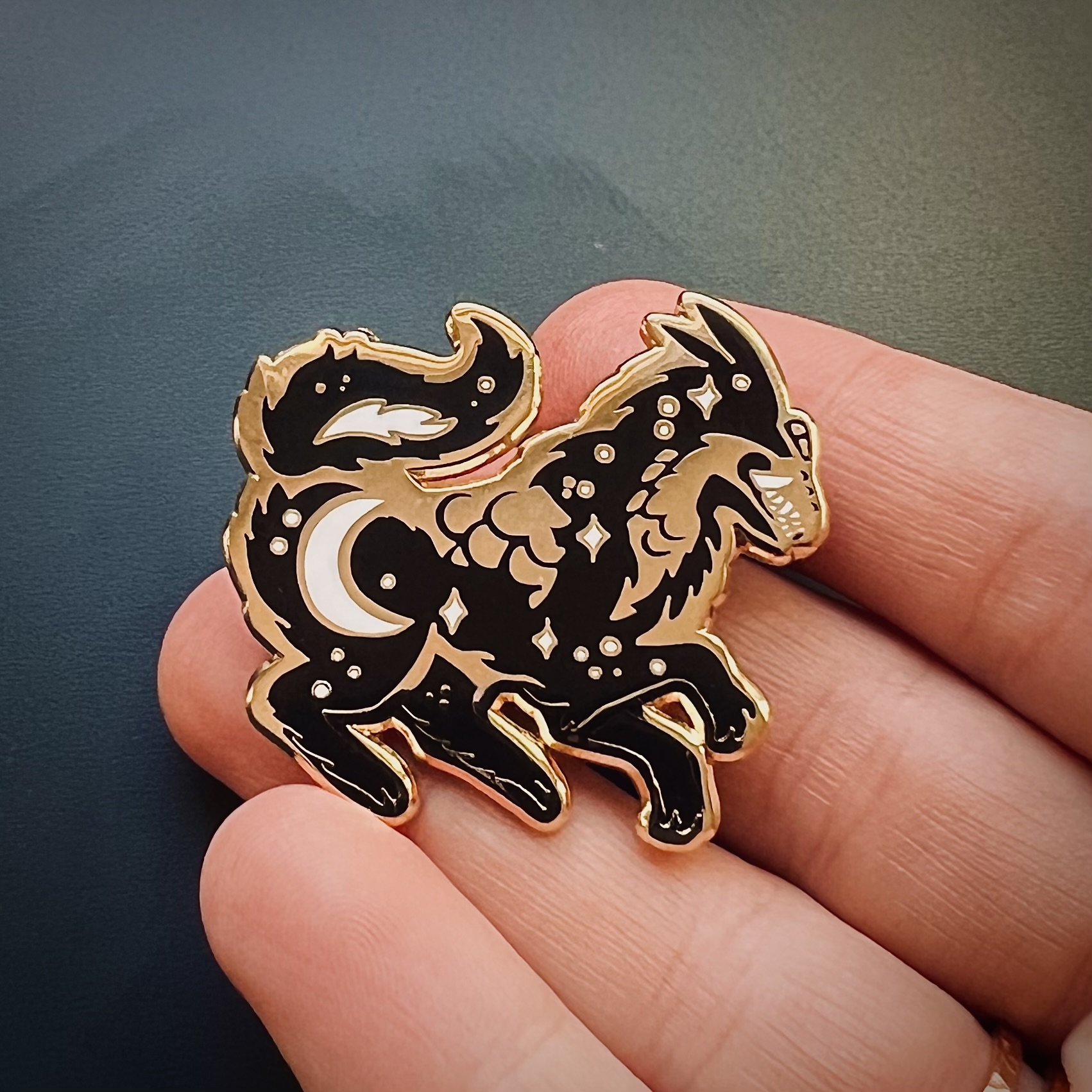 A gold and black enamel pin of a little celestial hellhound to guard you throughout your day! A cute pin to wear on your jackets, on a pinboard, a bag or a banner.